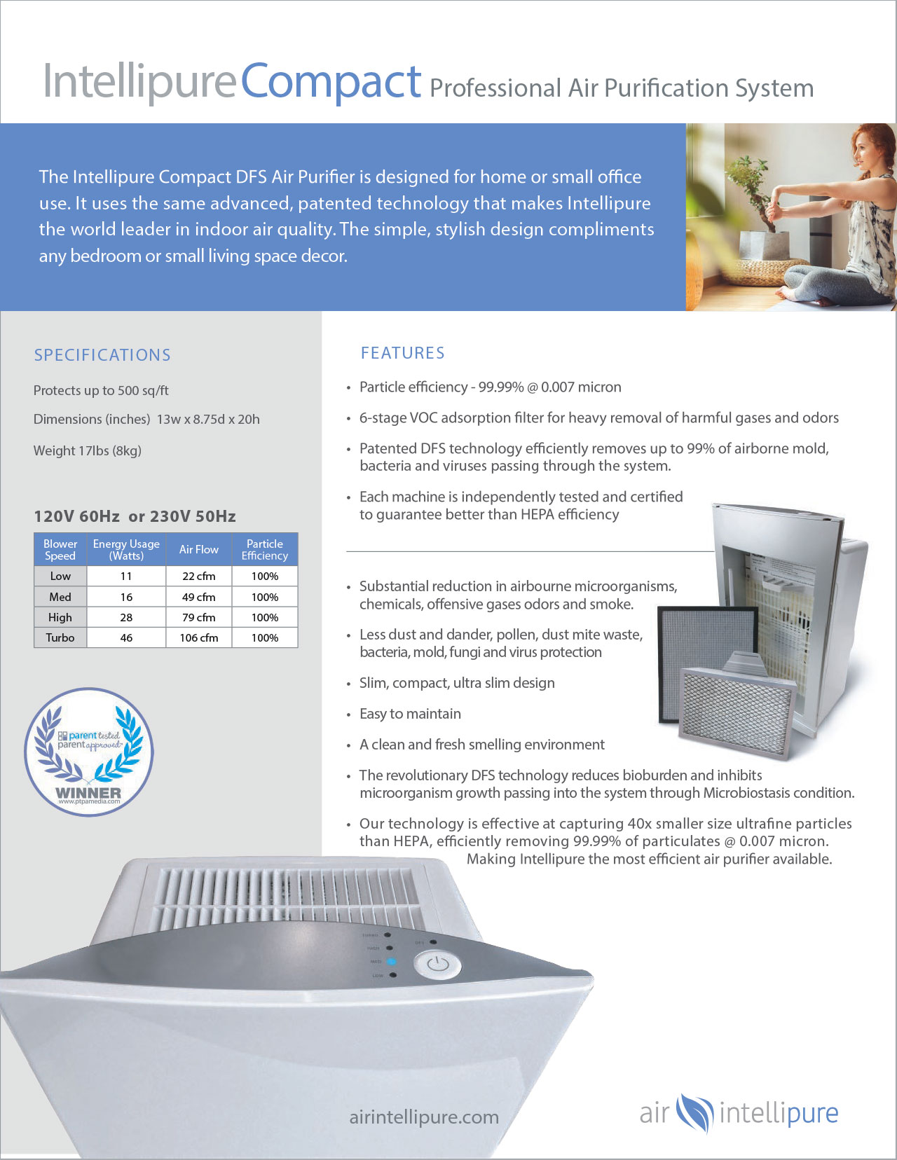 The Intellipure Compact DFS Air Purifier is designed for home or small office use. It uses the same advanced, patented technology that makes Intellipure the world leader in indoor air quality. The simple, stylish design compliments any bedroom orsmall living space decor.